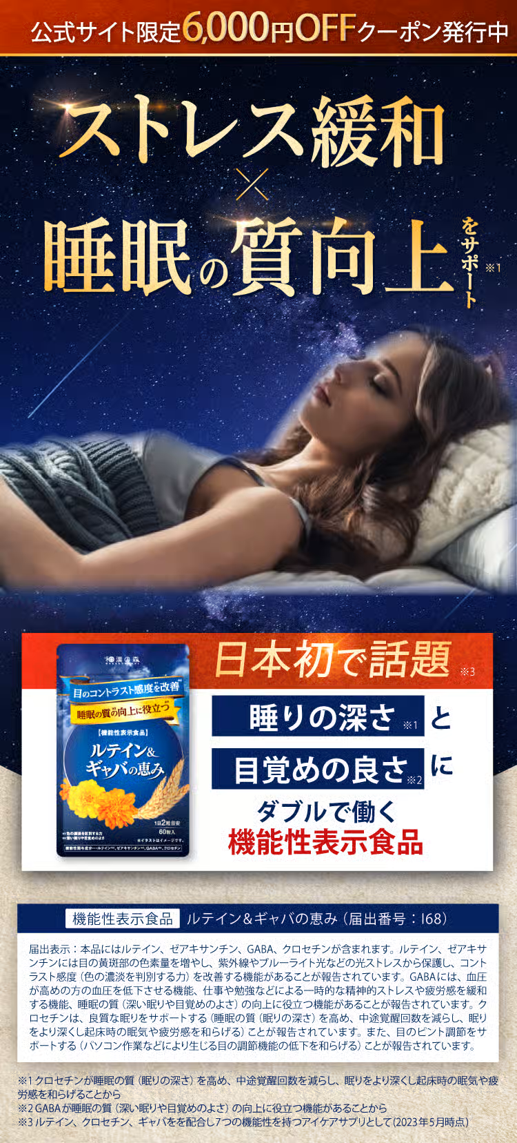 | ルテイン&ギャバの恵み | 目と睡眠をWケア。ストレス軽減にも◎ | 夜遅くまでスマホ・PCを使う人 |