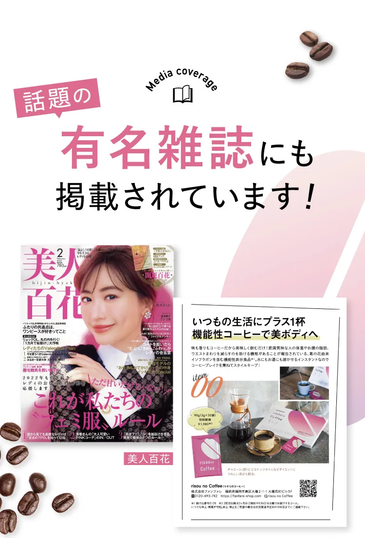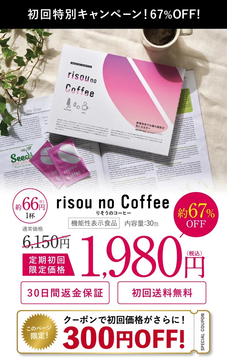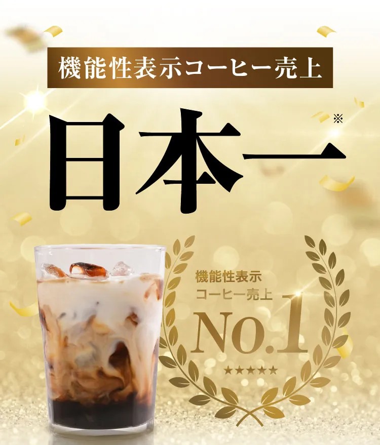 ※1 自社調べ(2013年3月~2021年9月の調査結果)※2 葛の花由来イソフラボン(テクトリゲニン類として)を含み、コーヒー・炭・MCTを配合した機能性表示食品として届出された情報にもとづき記載しています。※3 定期初回価格1,980円を30杯分として換算した参考値です。※4 本商品に含まれる葛の花由来イソフラボン(機能性関与成分)は、肥満気味の方のお腹の脂肪(内臓脂肪・皮下脂肪)に関する機能が報告されています。※効果を保証するものではなく、感じ方には個人差があります。