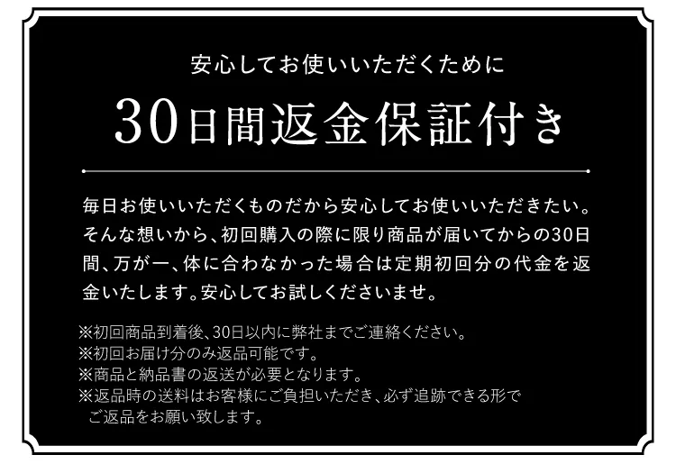 ※返金保証適用の際にはパッケージの返送が必要です。※初回商品到着後、30日以内に弊社までご連絡ください。