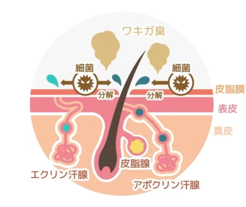 アポクリン腺から分泌された汗が、ニオイ菌のエサとなり時間経過とともにどんどん増殖して、あの独特なワキガ臭が発生するといわれています。※個人差があります。