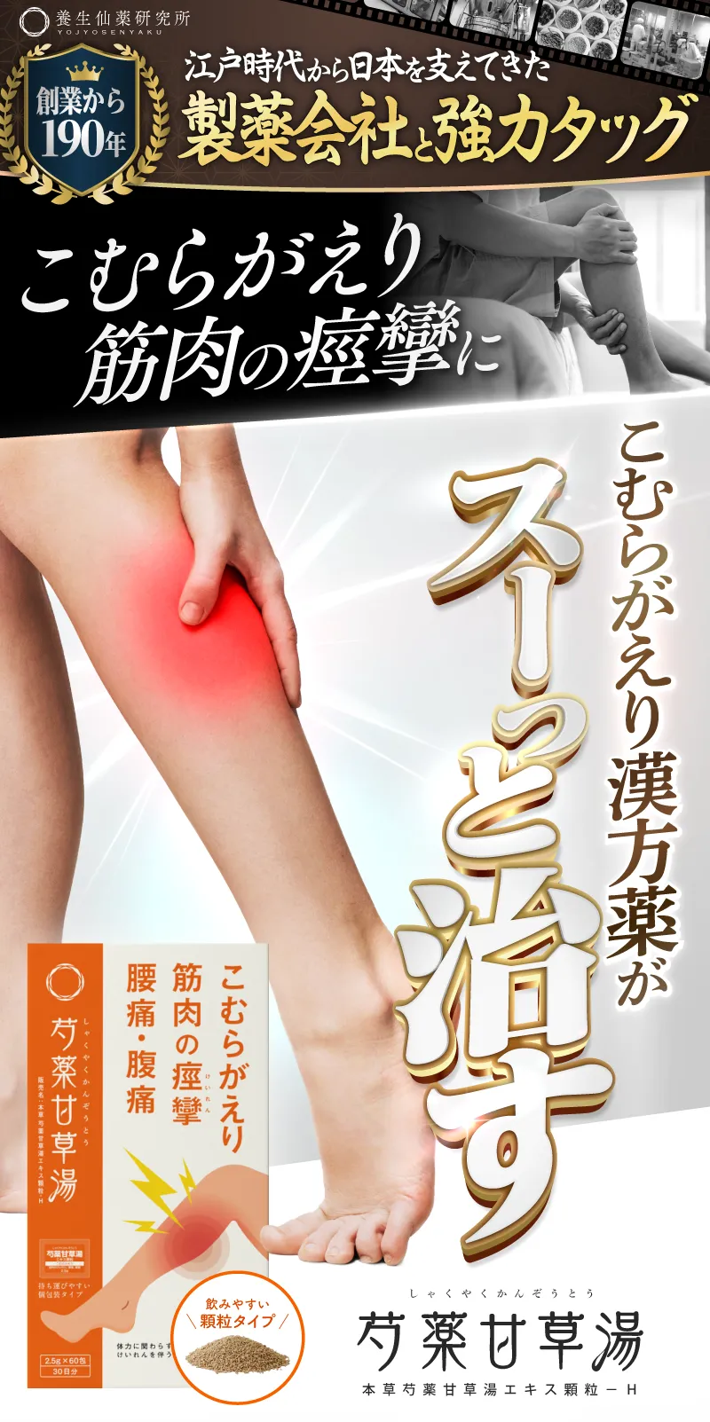 頻繁に脚がつる → 芍薬甘草湯(養生仙薬研究所株式会社)